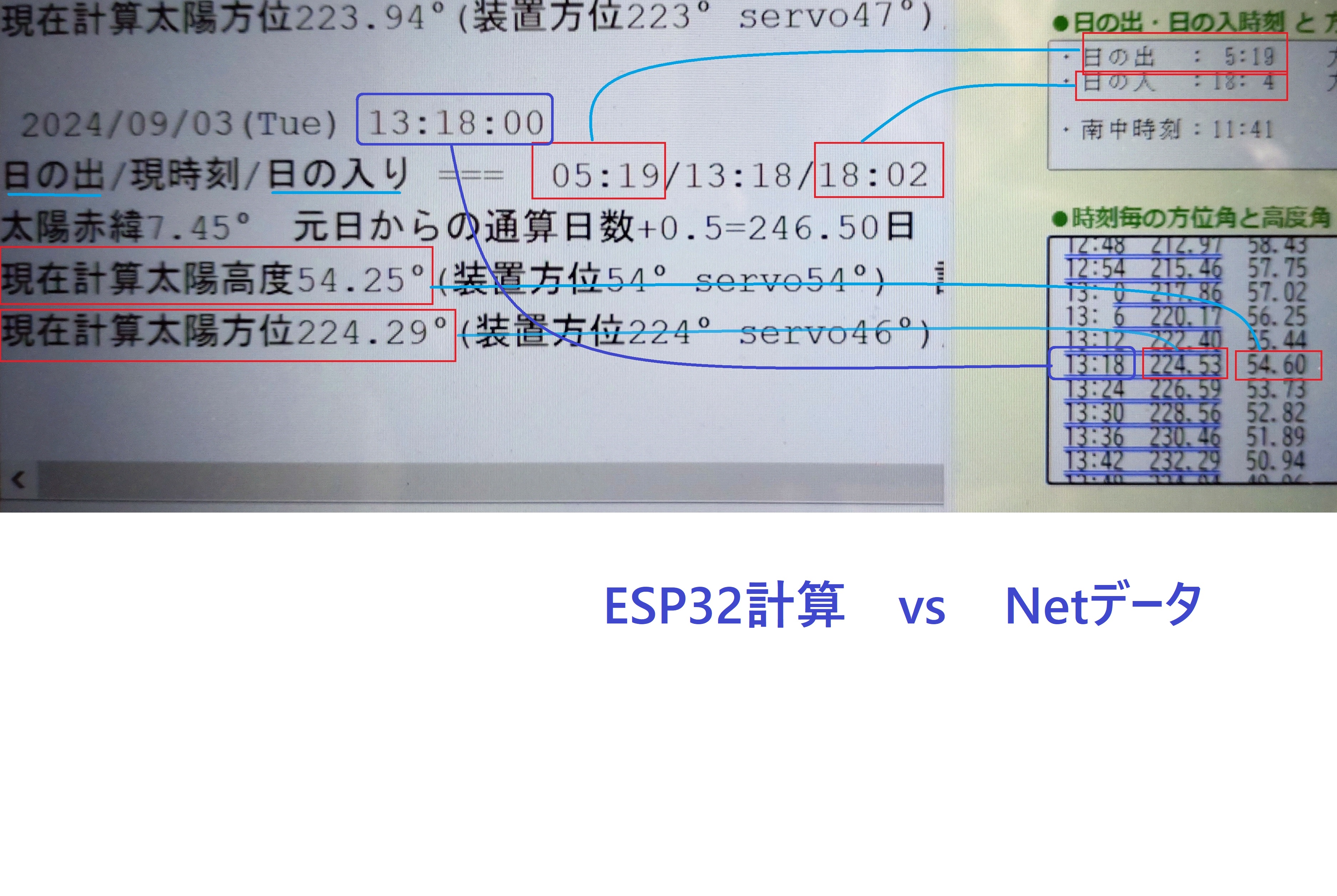 - 先回は太陽の動きを軌道計算結果のtableを作り追尾していたが、今回はESP32でJSTデーターからリアルタイムに高度 方位を計算し2つのサーボを動かし追尾を行った。