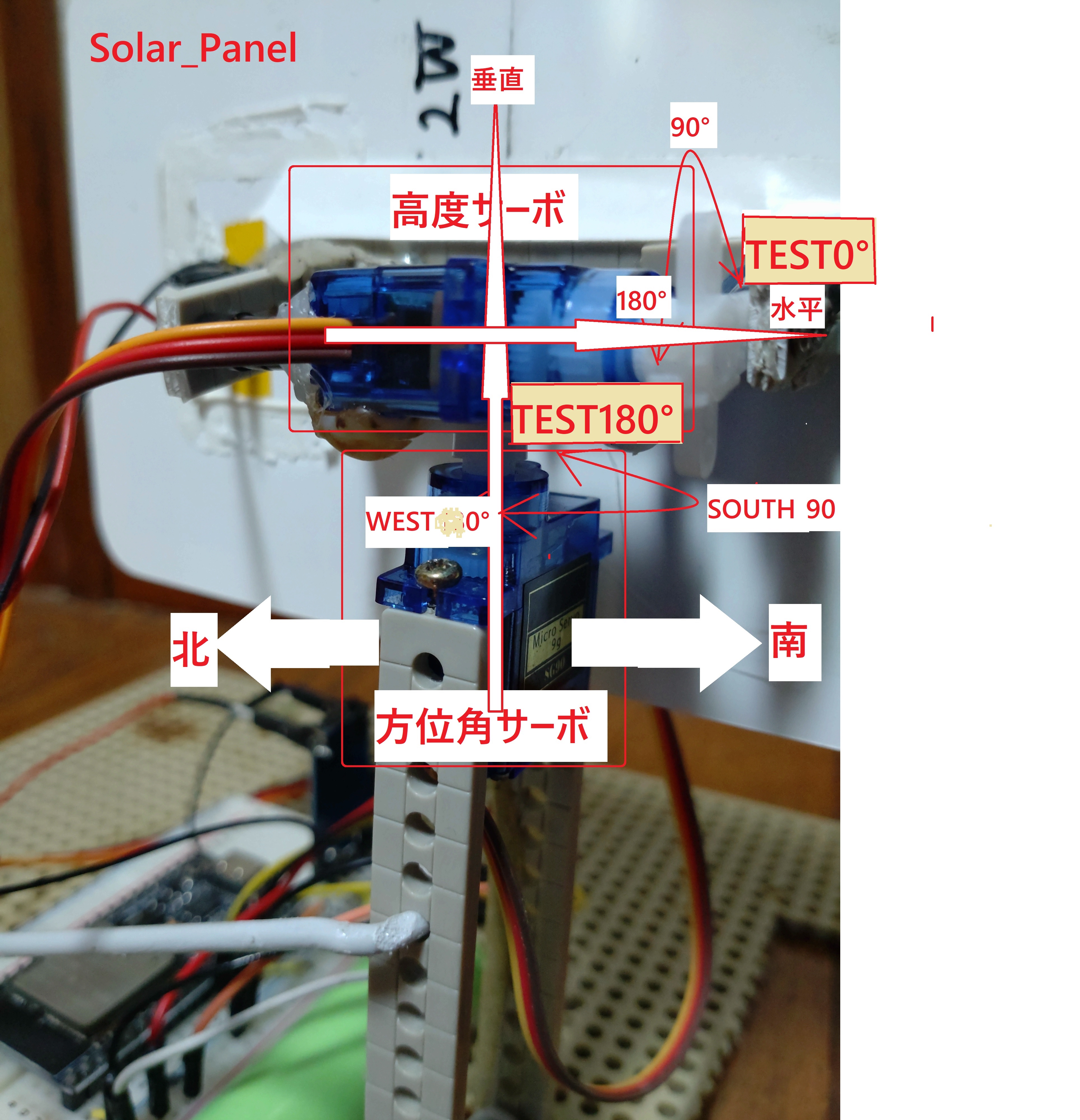 Serial.println("方位角サーボ180°(方位90°:東): 軸=垂直/天頂 軸囲りマーク=真東 軸と結合した高度サーボの軸=水平/真南");