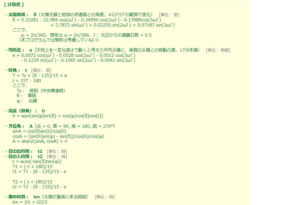 Serial.print("太陽赤緯");Serial.print(cald);Serial.print("° 元日からの通算日数+0.5=");Serial.print(J);Serial.print("日 均時差");Serial.println(eh);