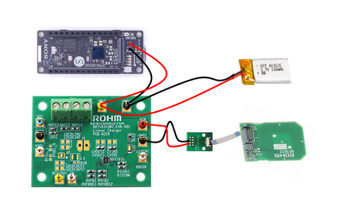 このように接続し、送信側のBP3621 広範囲給電型ワイヤレスチャージャーモジュール (送電モジュール)で、給電してあげると、