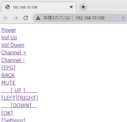 これでWi-fi経由でESP32-DevKitCにアクセスすると、下図のようなリモコンを模したテキストページが表示され、リンクになっている文字をクリックするとリモコンの信号が赤外線LEDから発信されます。