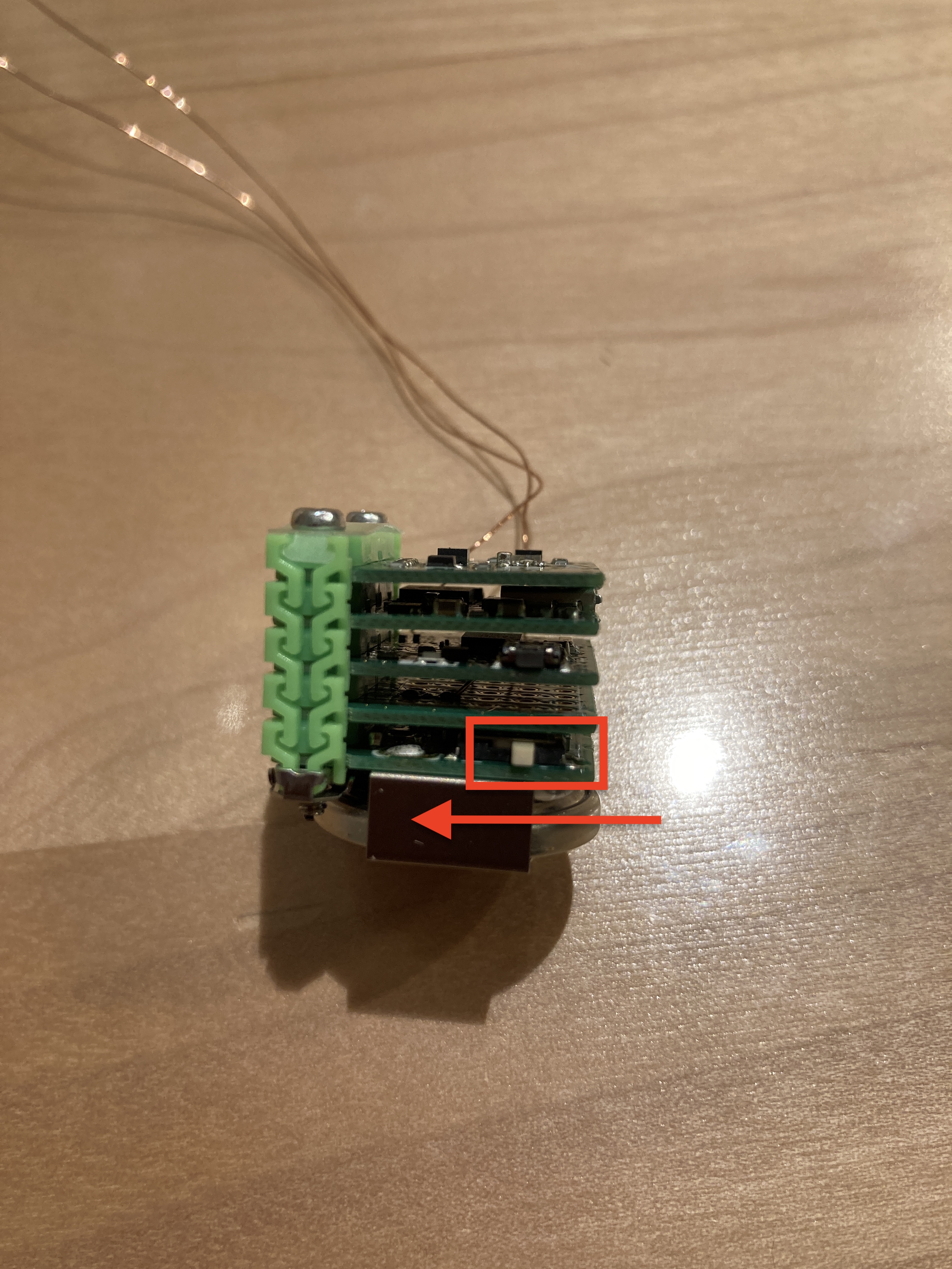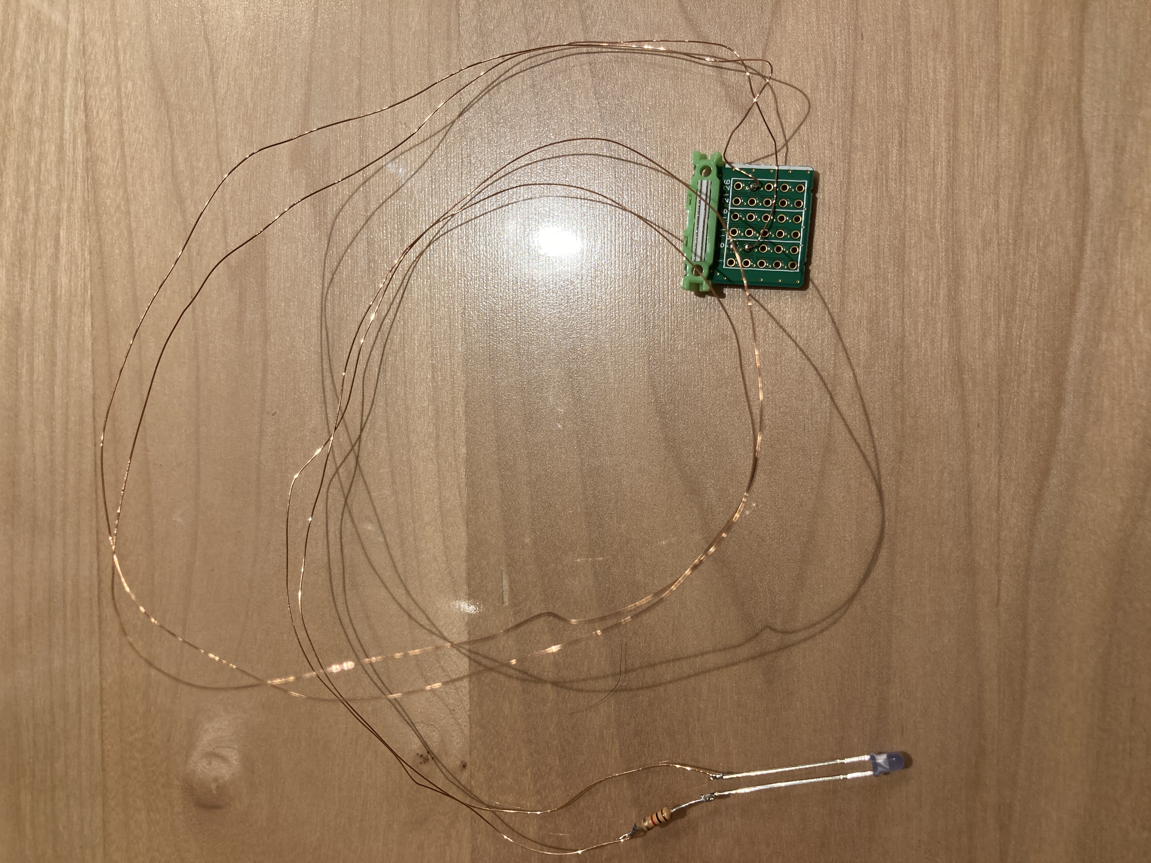 ポリウレタン銅線から抵抗⇛LEDを経由しGNDにはんだづけします。