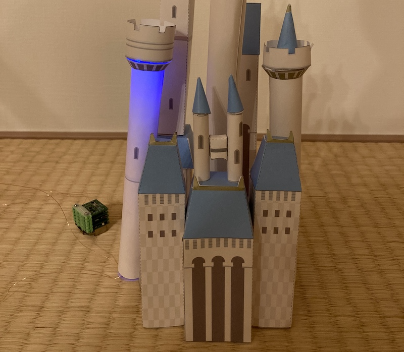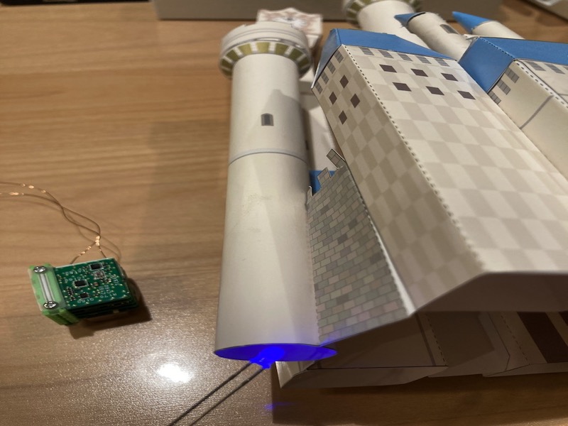 LEDが点灯し始めたらLEDをシンデレラペーパークラフトのタワーの中に入れます。