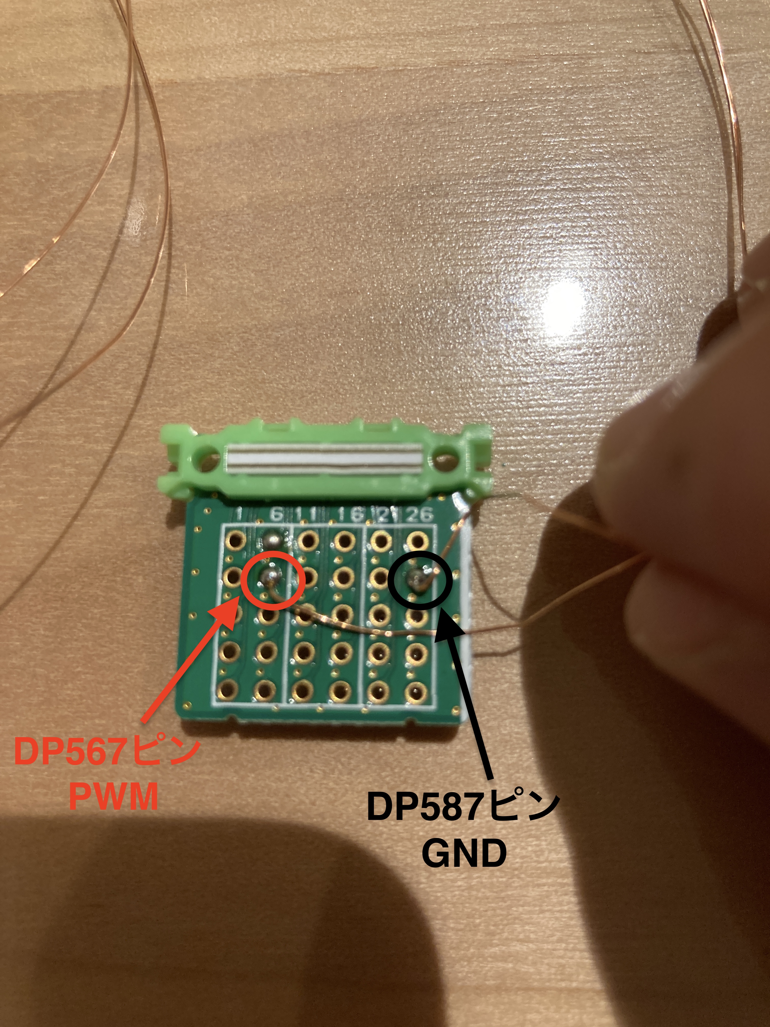 部品配置図からDP567の配置場所がわかりました。ここがPWM機能ピンになります。
