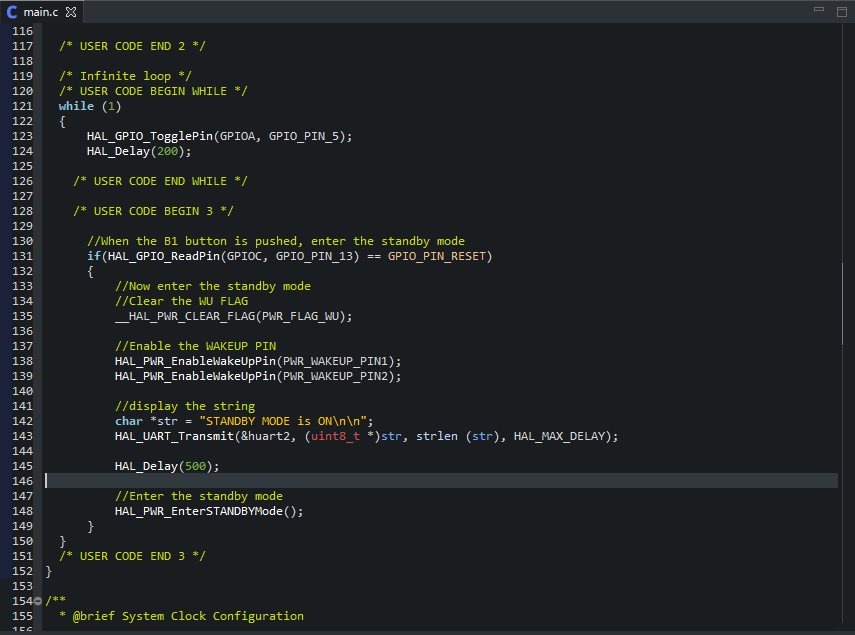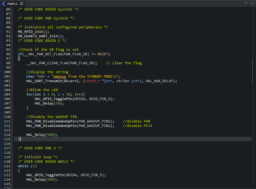 以下がSTANDBYモードに移行するためのコードです。STANDBYモードに移行するまでは、LEDが点灯し続けます。またSTANDBYモードに入るときは必ずウェイクアップピンを有効にして下さい。