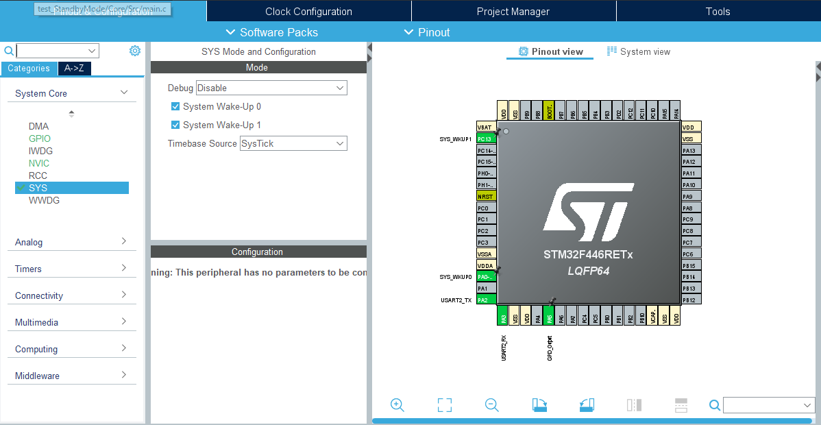 STM32F446RETではPA0ポートとPC13ポートをウェイクアップ入力として利用できます。今回はUSER Buttonが接続されている、PC13ポートのWake-Up 1を使います。