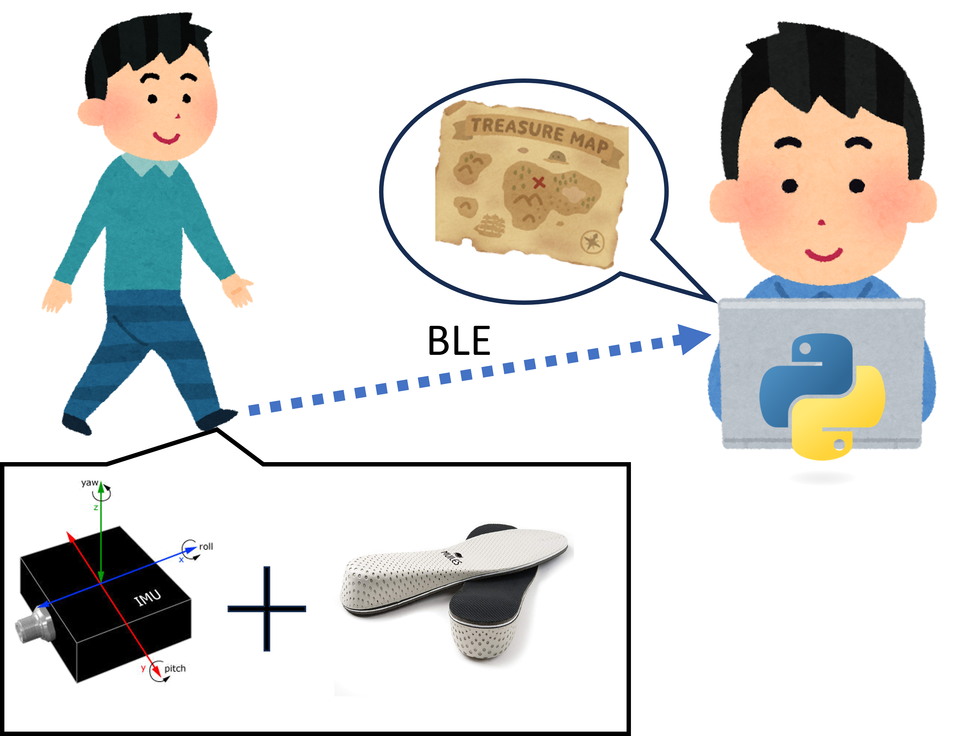 今回は歩行が周期的な運動であることに着目し、足が静止している間の加速度・角速度の期間の積分を速度・角度・位置の算出から除外することで位置の推定精度を高めています。