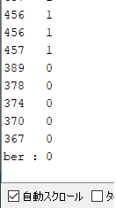 今回は通信系の評価ということで出力信号には512ビット(511bit + 最後のビットに0)のM系列を使用しました.シリアル出力にはアナログ入力の値と送信した信号の0と1が各ビットごとに書かれています.最後の行はビットエラーレート(BER)で,今回の通信がエラー0で行われたことを示しています.