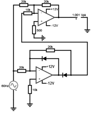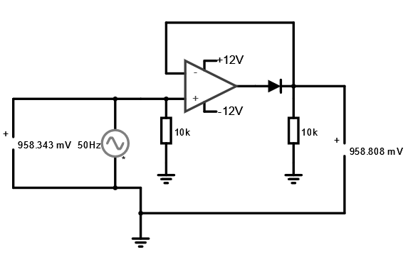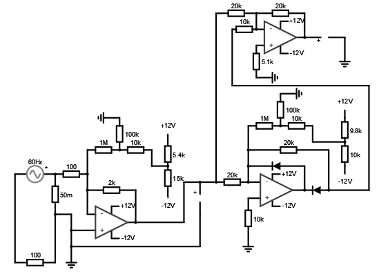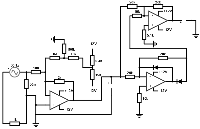 いろいろ調べてみましたが、理解できたのが「ダイオードの電圧降下をオペアンプを使って補正する」という方式だけだったので、今回はこれを用います。調整回路は置いといて、理論上は次のような回路で表されます。