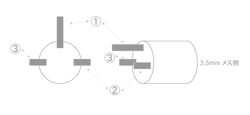 端子側を手前にし、上に長い端子を向けた状態で、上①: GND、右②: Lチャネル、左③: Rチャネル