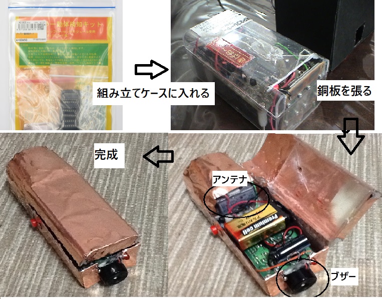 このKIT単体をそのまま使うと、近傍では指向角が360度あり目的以外の動きまで反応するので使いずらい。この為銅のケースでシールドして指向性を付ける事を考えた。しかしながら銅のケースを加工し、中に本体を組み込むことっは素人にとっては手が出ない。試しにプラスチックケースに回路を組み込みそのケースに薄い銅板を張り付ける方法を試みたところ、そこそこの指向角が得られたので紹介します。