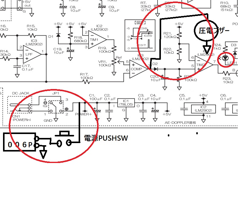 ①圧電ブザーをIC3の7pin とアースの間に追加