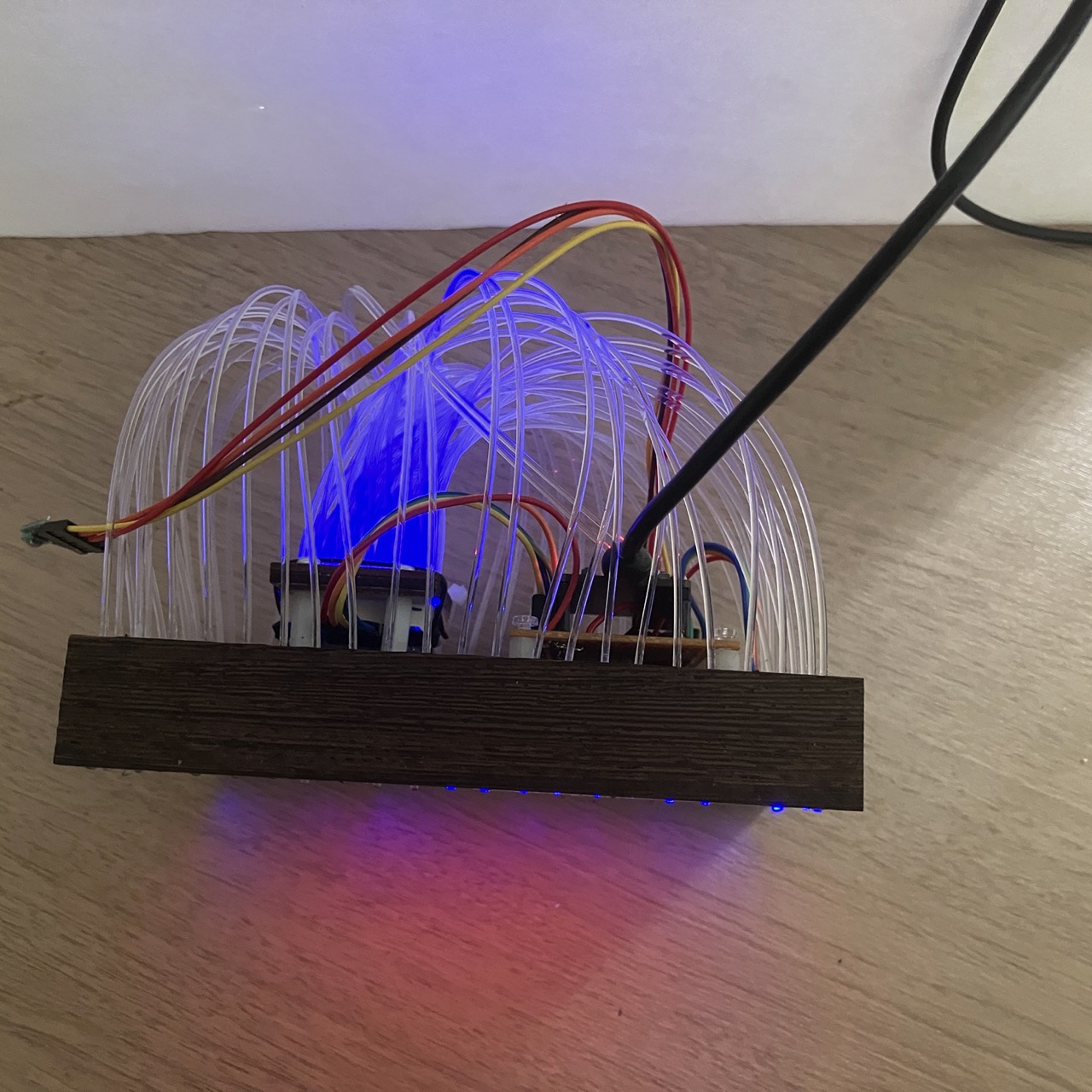 シナ合板をレーザーカッターで2mmの穴を8×8個開けてファイバーを通します。 - ファイバーとLEDの接合