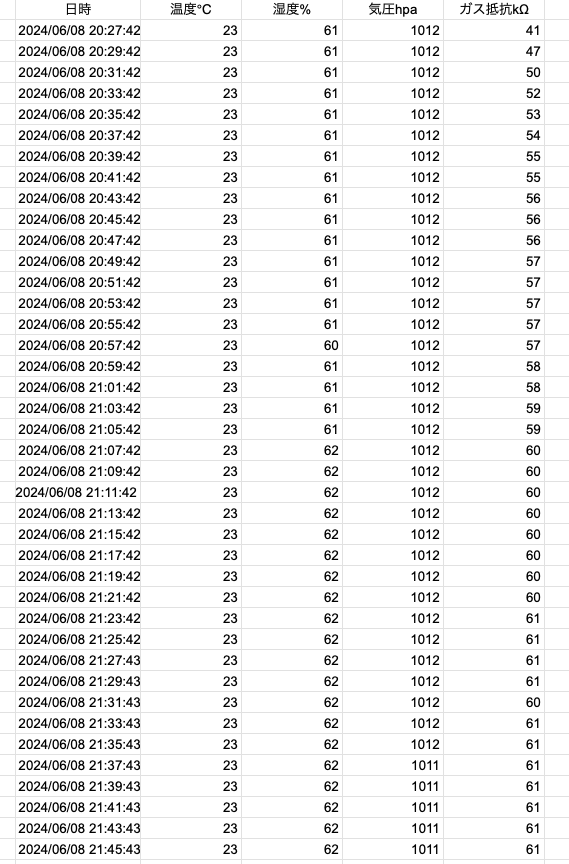 Googlesheetへの2分間隔でのロギング結果を下記に乗せます。