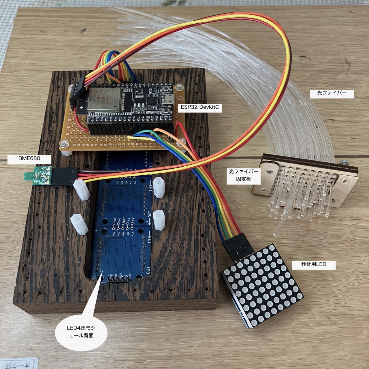 ネットワーク時計を作ります。無垢の木材にLED8×8ドットマトリクス4連を嵌め込み、外周に光ファイバーの秒針を埋め込みます。光ファイバーはLED8×8ドットマトリクス1個に60本取り付けます。時刻はNTP(Network Time Protocol)で時刻同期します。