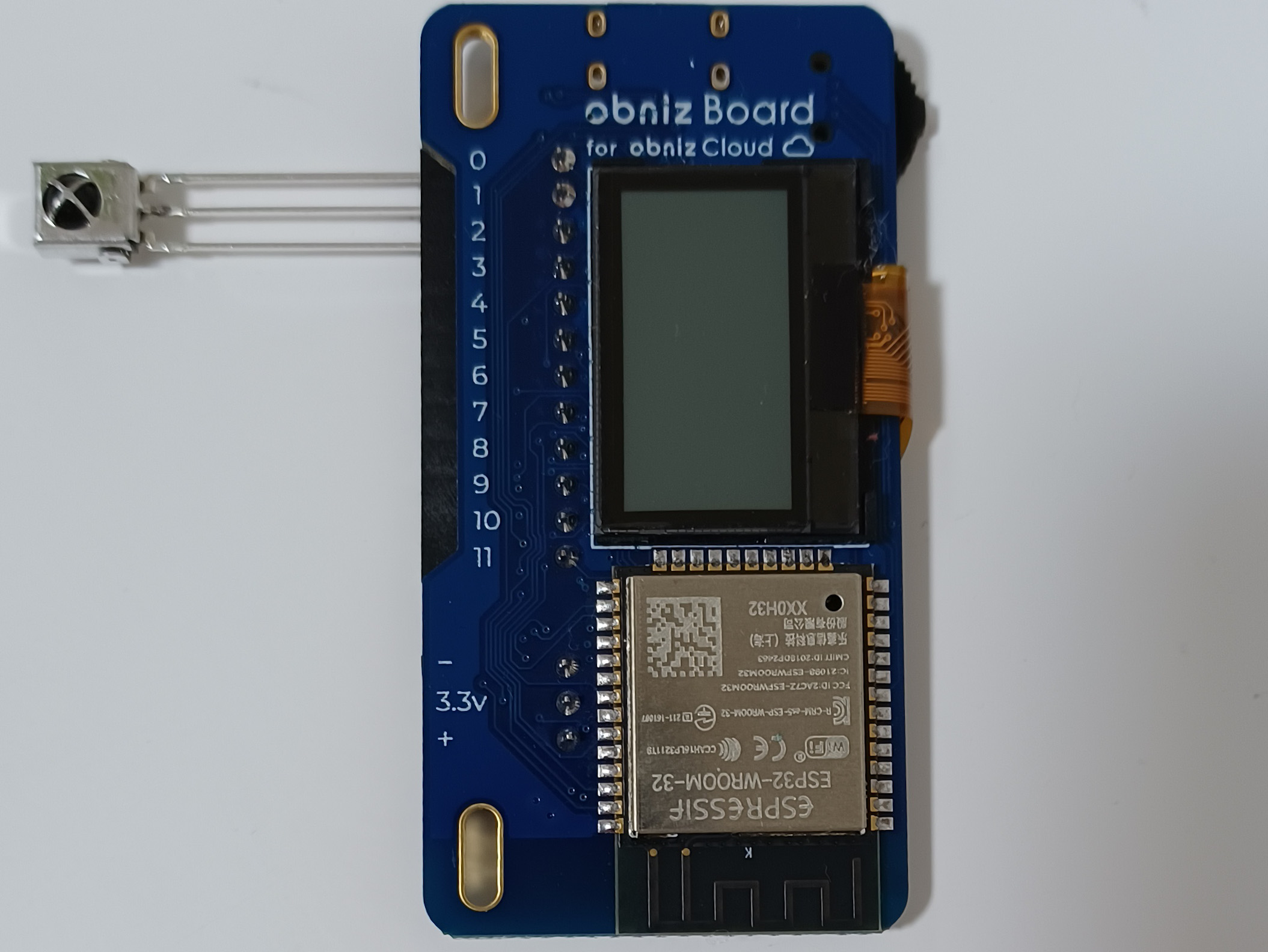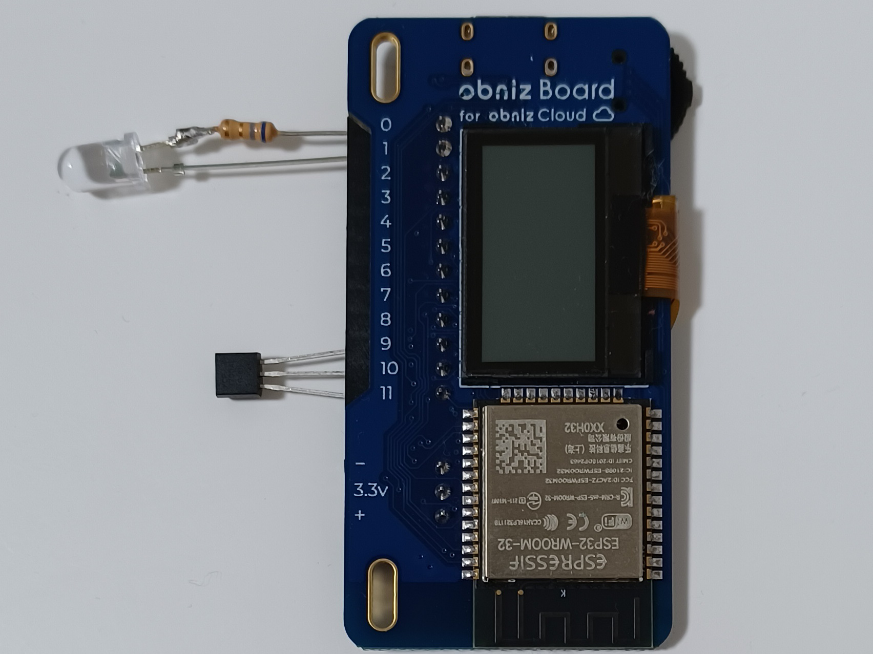 温度センサーと先ほど抵抗をつけた赤外線LEDをobnizに接続します。