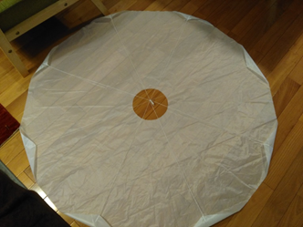 半径80cmに切断し、中央に空気が逃げるための穴を半径20cmの大きさで空けました。外形は正八角形になるように周辺を切断し、頂点となる部分からタコ糸を伸ばして中央でまとめました。