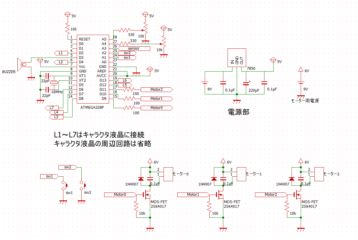 基板を作成します。小型化のために、基板の真上に液晶を設置しましたが、かえってノイズでキャラクタ液晶の表示が乱れてしまいました。モーター駆動用のMOSFETだけ別の基板に分けるとおさまりました。