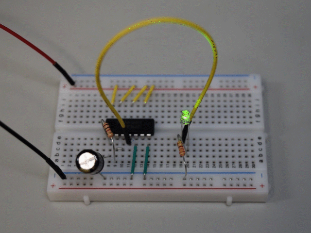 74Logicというとデジタル回路を作るときの構成部品として使うのが一般的ですが、いきなりこのようなアナログな使い方でLチカさせてみました。