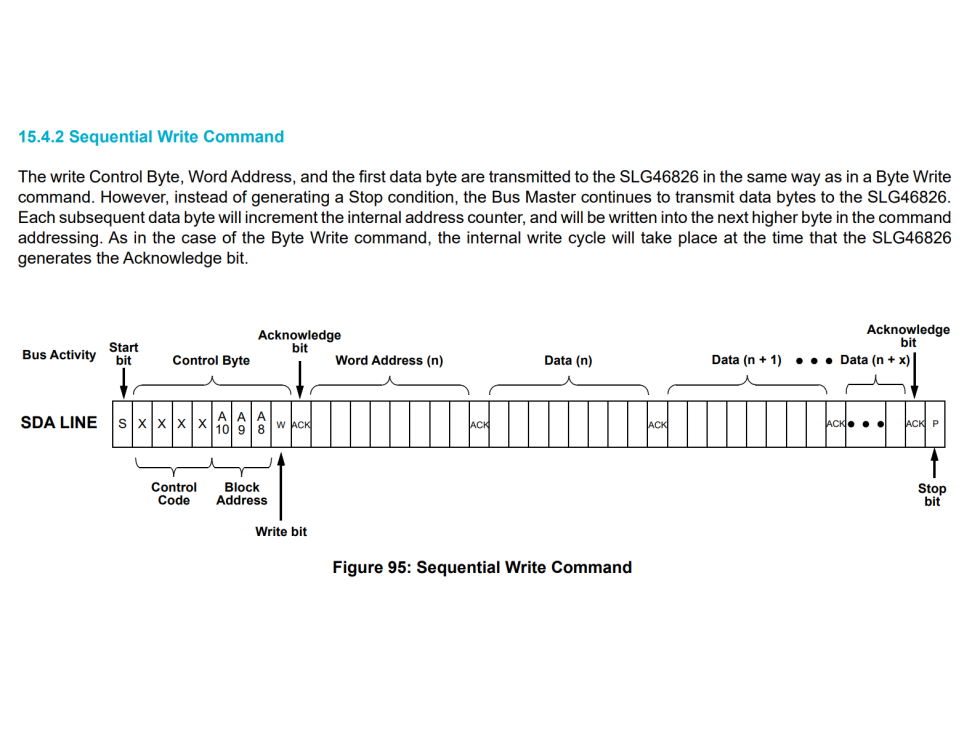 SLG46826 への書き込みは I2C で行う。書き込みの際の通信データは、Control Byte、書き込み開始アドレス、書き込みデータの順に送信する。
