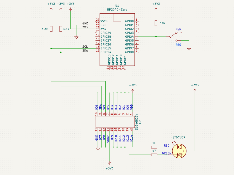 SLG46826 は I2C でプログラミングを行うので、I2C ポートを持ったマイコンを使用する。独立したプログラマーとして使用することも考慮し、記録デバイスとして認識できるように RP2040 を選択した。素直に Raspberry Pi Pico を使用してもよいが、小型化のために RP2040-Zero を採用した。RP2040-Zero は、ピンに出ている I/O ポートが少ないだけで、基本的には Raspberry Pi Pico と同じであり、ファームウェアも同一のものが使用できる。