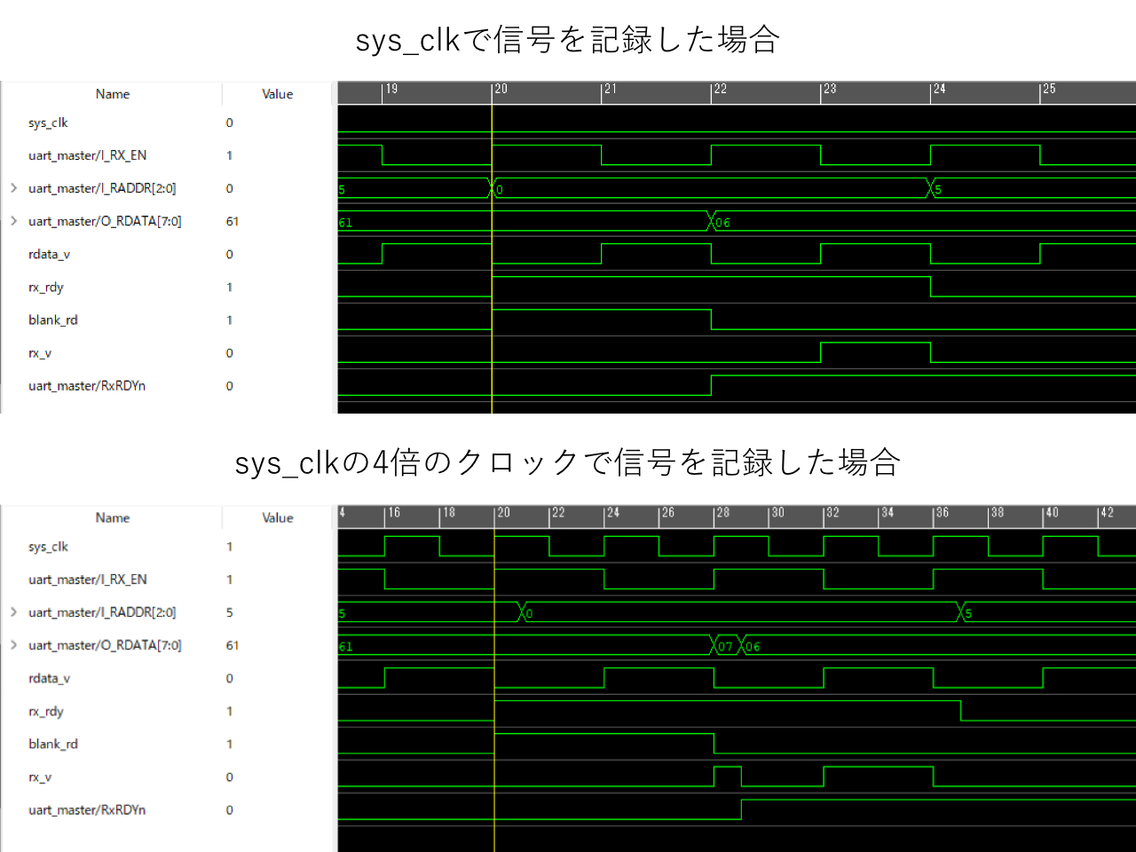 次に図の下半分(sys_clk の 4 倍のクロックで信号を記録した場合)に注目します。4 倍のクロックでサンプリングしたため、sys_clk の変化も捉えることができています。