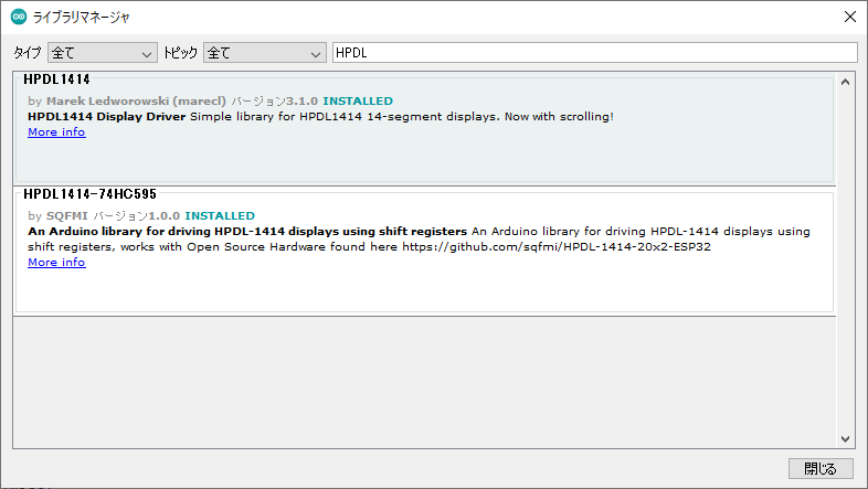 Arduino IDEのライブラリマネージャで検索すると二つのライブラリがヒットします。今回は一つ目のHPDL1414というライブラリを使用します。