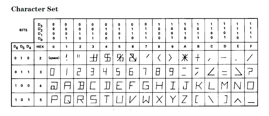 表示できる文字は上図の通りなのですが、ASCIIコードの32番から95番の64個のキャラクタについて、バイナリ値にそのまま対応しています。ほぼ問題なく読めますが、"#"は初見では何なのかわかりませんでした。