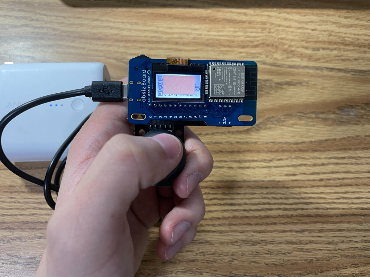 近く側(obnizの液晶)と遠く側(PC)を交互に見ながら、表示される矢印をjoyStickで入力していく様子です。