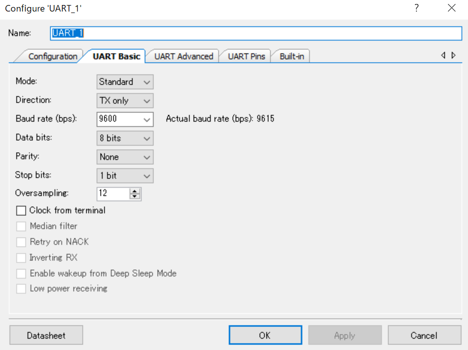 PCのUSBを通して信号を送信するにはUARTを使用します。送信する際はTXを使用するのでDirectionをTXonlyとしてそのほかのパラメータは画像のように設定します。