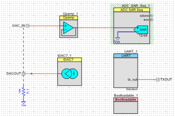 12bitのADコンバータの入力の前段にバッファ回路を挟み、電圧を読み取ります。このようにすることで入力ピンのインピーダンスが大きくなり、測定対象の回路に影響なく電圧を図ることができます。またPSoCのADコンバータの入力インピーダンスが小さいので、正確にデジタル変換するためにはこのようにする必要があります。