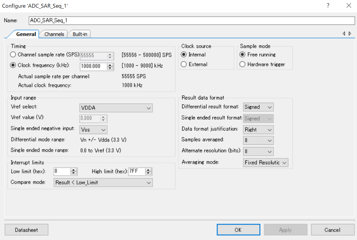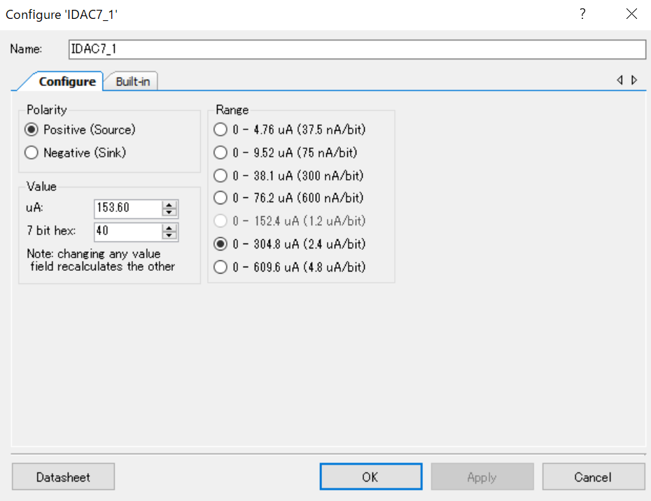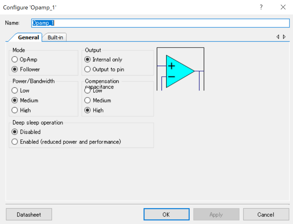 またOutputではオペアンプ出力をピンに出力する場合はOutput to pinを選択し、ピンに出力しない場合はInternal onlyを選択します。今回はピンに出力しないのでInternal onlyを選択します。