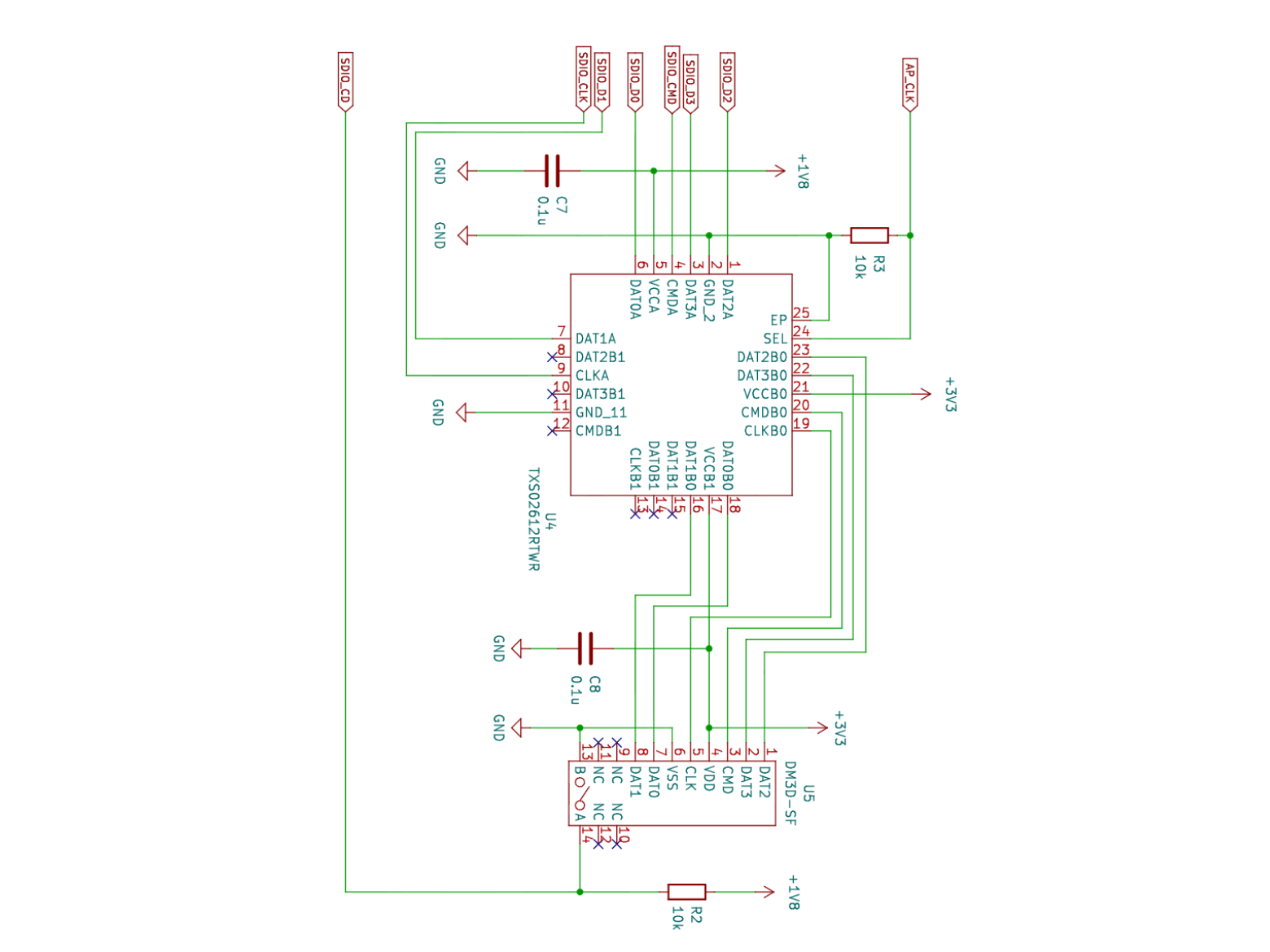 SPRESENSEのIOは1.8Vのため、SDIOの電圧レベル変換ICを実装しています。
