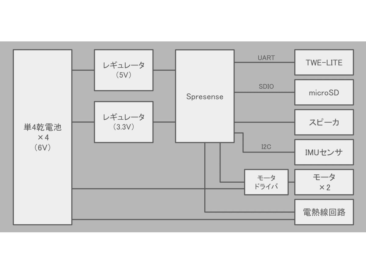 5V電圧はSPRESENSE本体へ、3.3V電圧はIOのレベル変換やセンサなどへ供給します