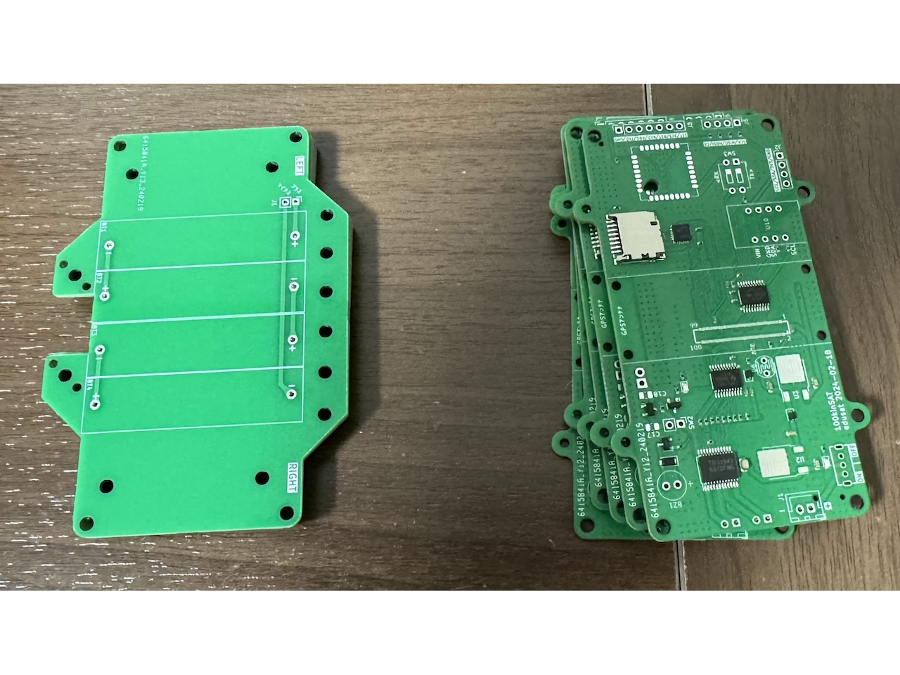 100kinSATの基板は、100mm x 50mmの2層プリント基板2枚(トップ基板(画像右)とボトム基板(画像左))で構成されています
