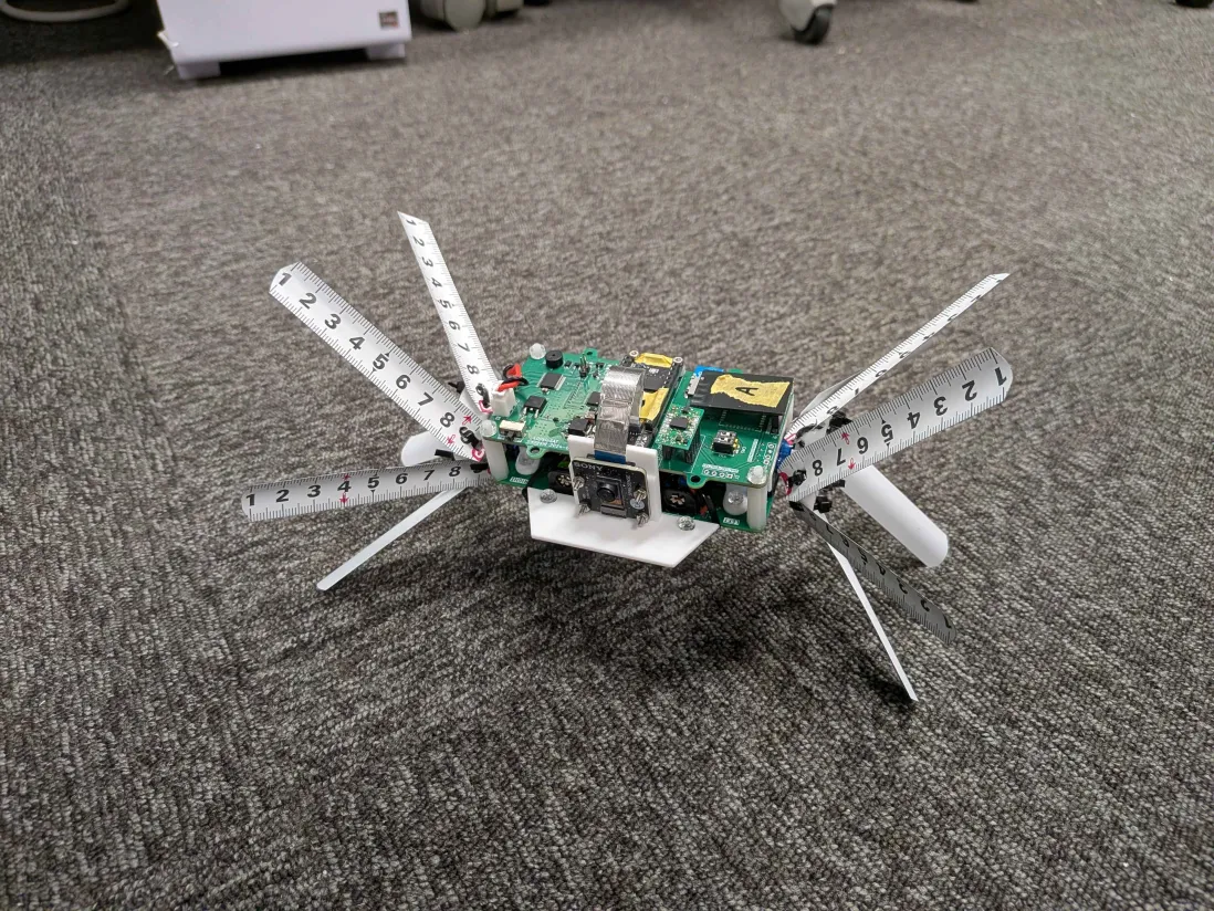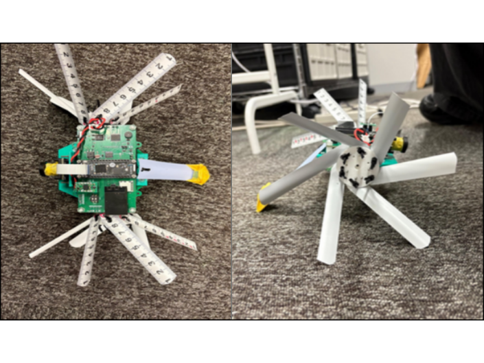 そこで、市販の巻尺(メジャー)を素材としたタイヤを採用しました。メジャーは押し込んで畳むことで小さく収納でき、ケースが展開されると自身の弾性で自動的に元の形状に戻ります。これにより、モーターなどの展開機構を必要とせず、大きな接地面積を確保できるため、悪路でも走破可能な設計を実現しています。