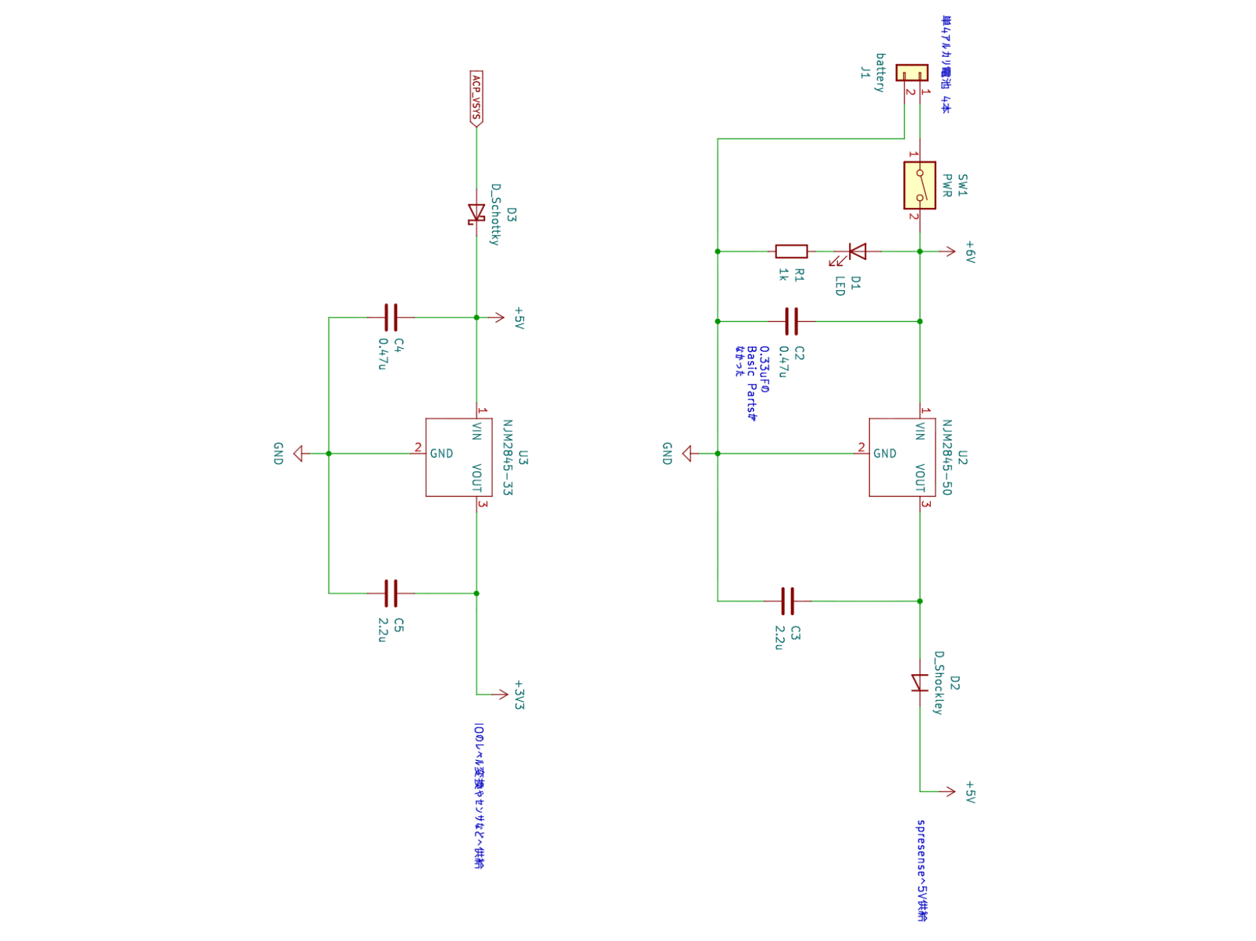 単四電池4本を直列に接続した6V電源からレギュレータを通して5Vと3.3Vを生成しています