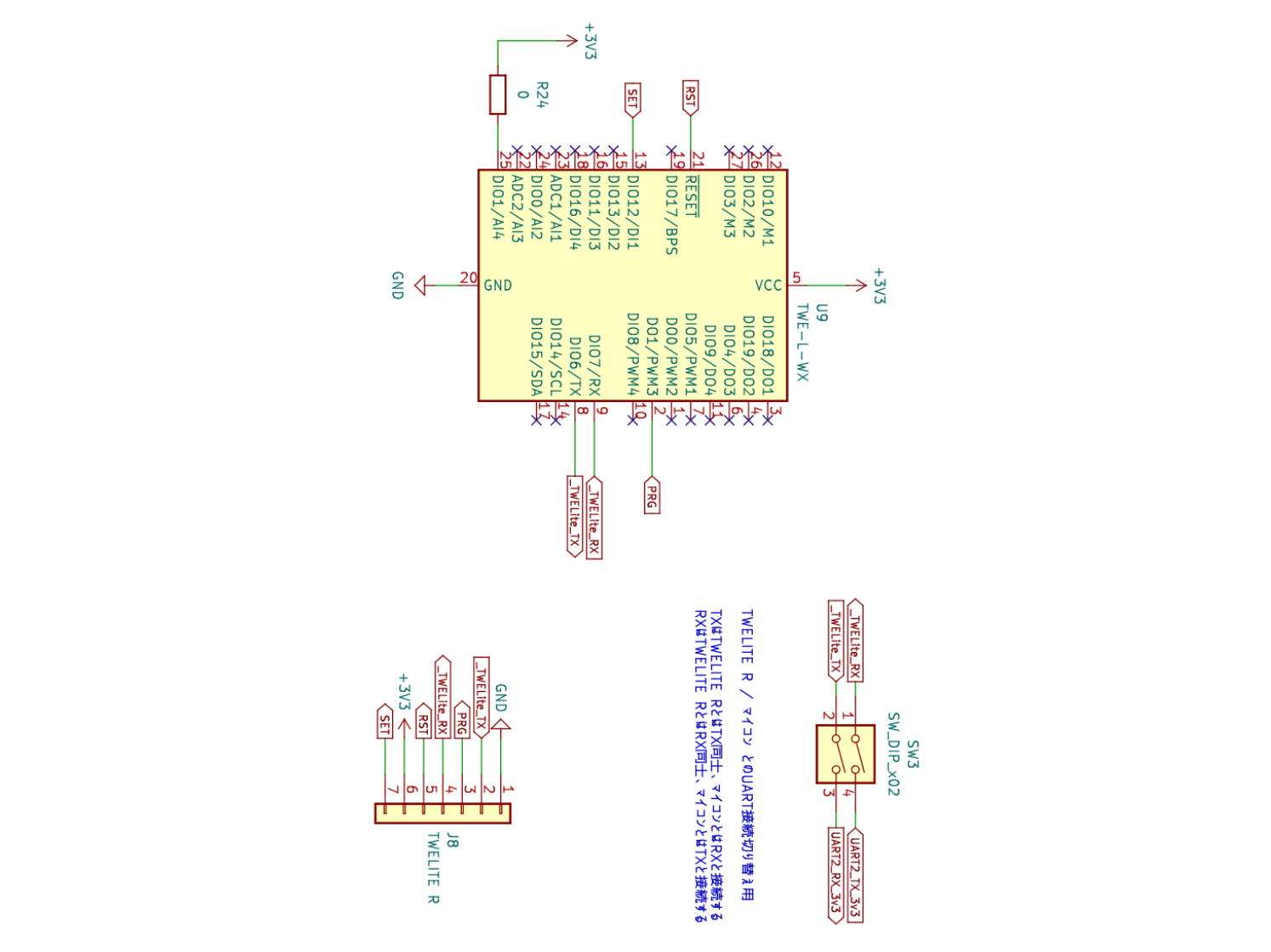 また、TXとRXのUART配線の途中にスライドスイッチを設けています。これは、TWE-Liteのファーム書き込み時にスイッチをオフにすることで、SPRESENSE側のUARTプログラムがファーム書き込みへ影響を与えないようにするための工夫です。