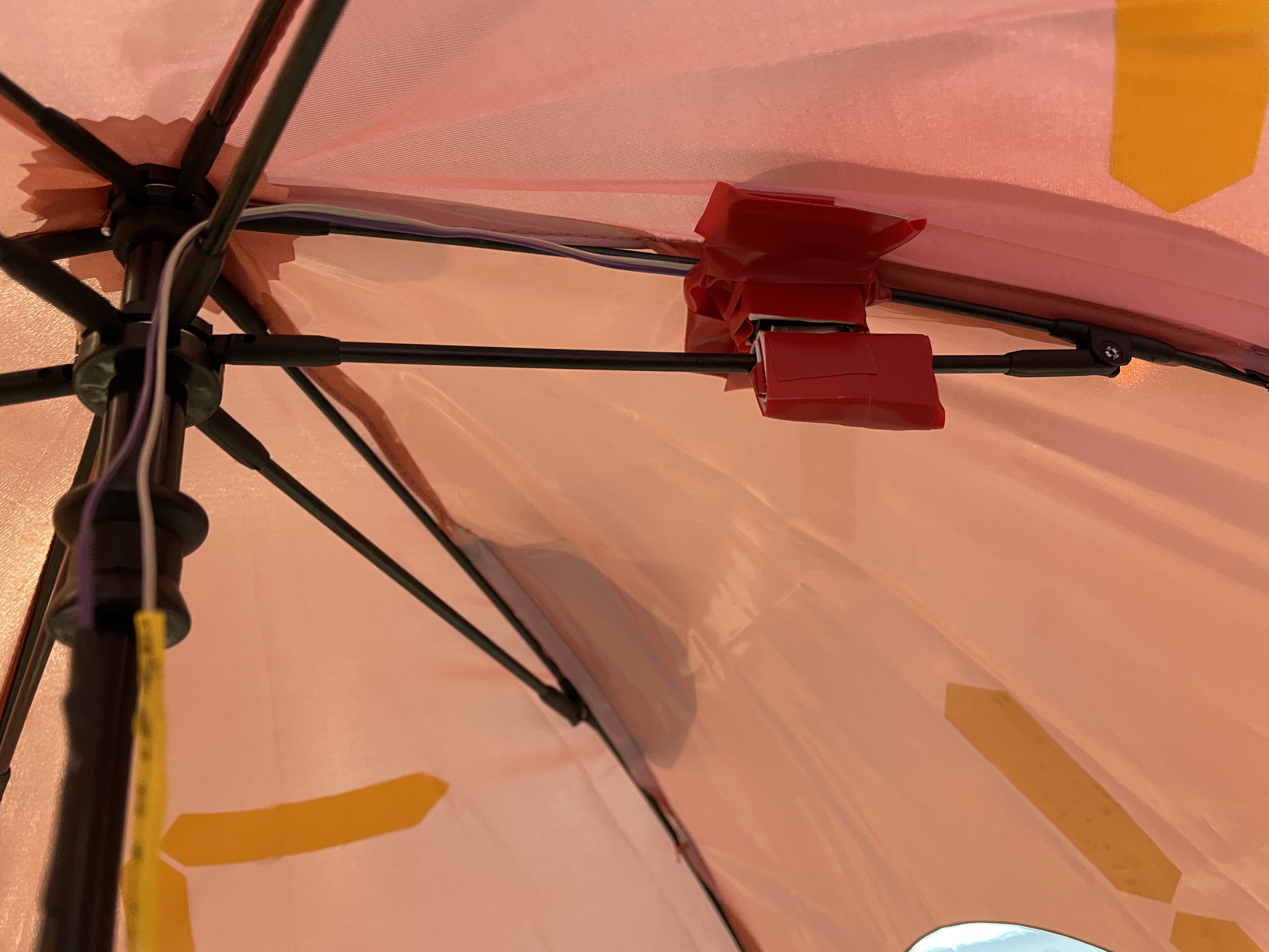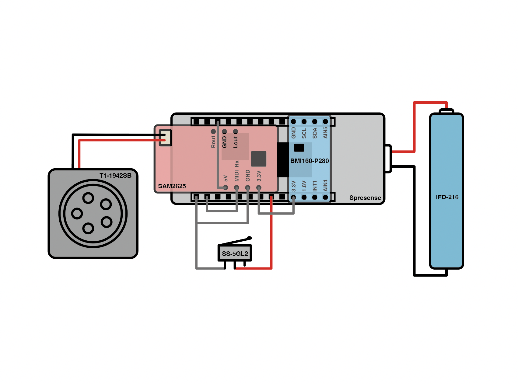 制御については傘に加速度・ジャイロセンサーを取り付け、その値から傘の傾き方向や大きさを算出し、その値に応じた音を鳴らす仕組みとなっています。