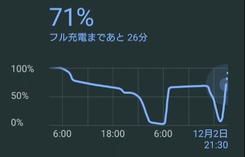 20:00の時に1%だった4000mAhの電池を積んだスマートフォンを1時間充電して、21:00には71%まで充電することが出来ました。
