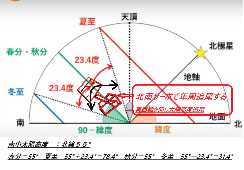 日中 :太陽パネルを東から西に北極星を軸とした南側円を描きJSTで4分に1度回転(中学理科の太陽運動より)