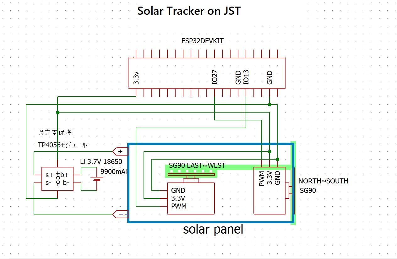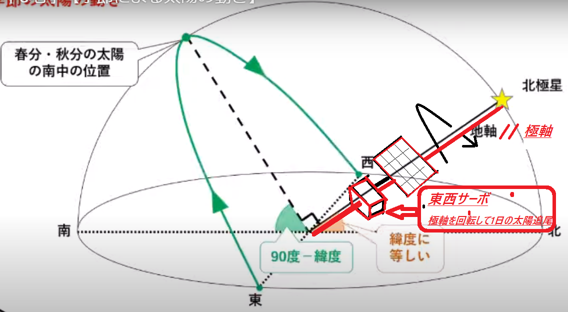 当初は太陽位置をリアルタイムで計算し赤道儀構造を使わず直角に配置した方位と高度サーボだけでSolarTrackeしようと挑戦したが、三角関数の計算が難解で撃沈 今後の課題(計算式太陽の高度と方位角)。