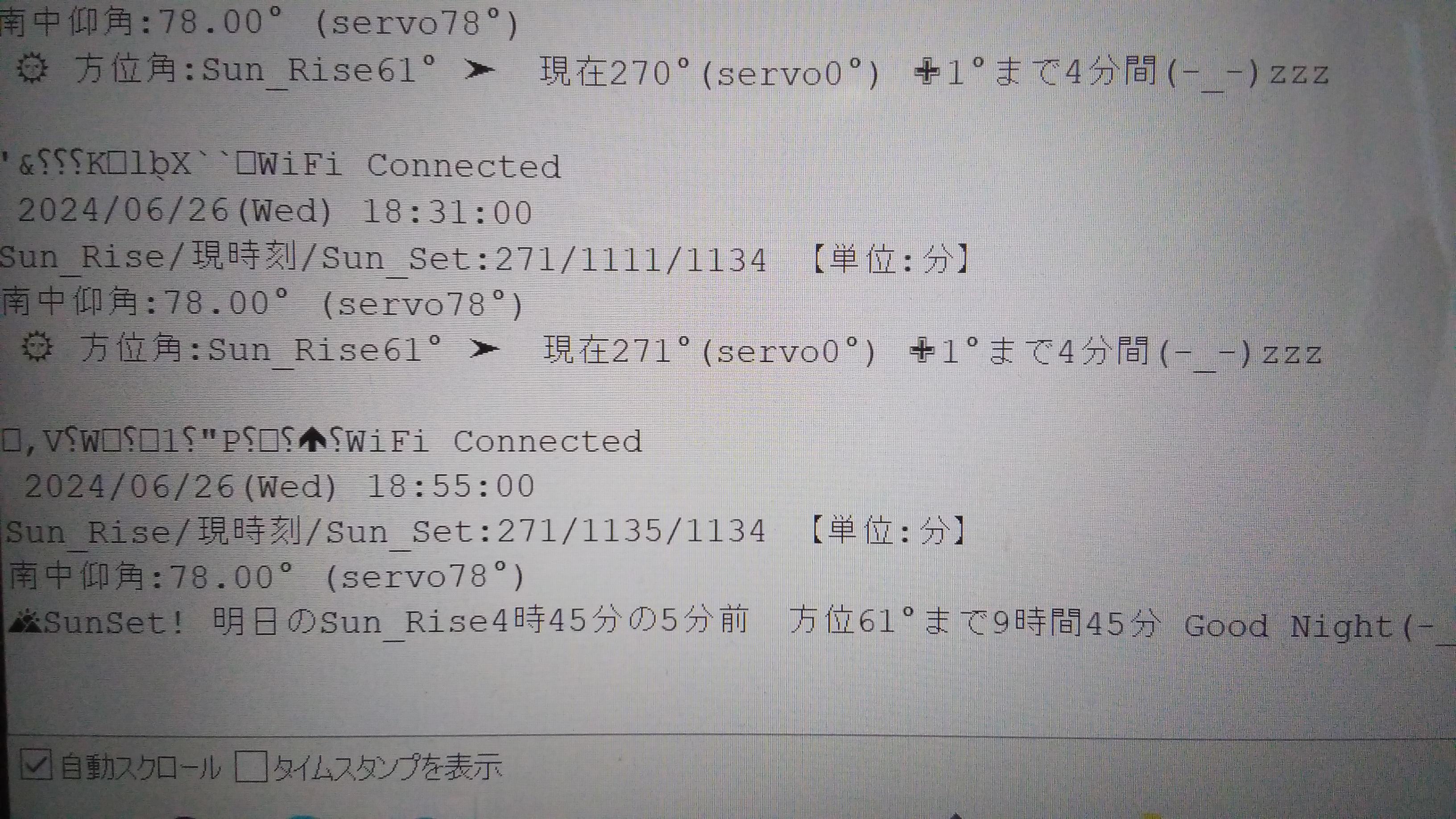 Serial.printf("🌄SunSet! %d時%d分パネルを東に戻しSun_Rise%d時%d分(方位%d°)の5分前までsleep \n\n",