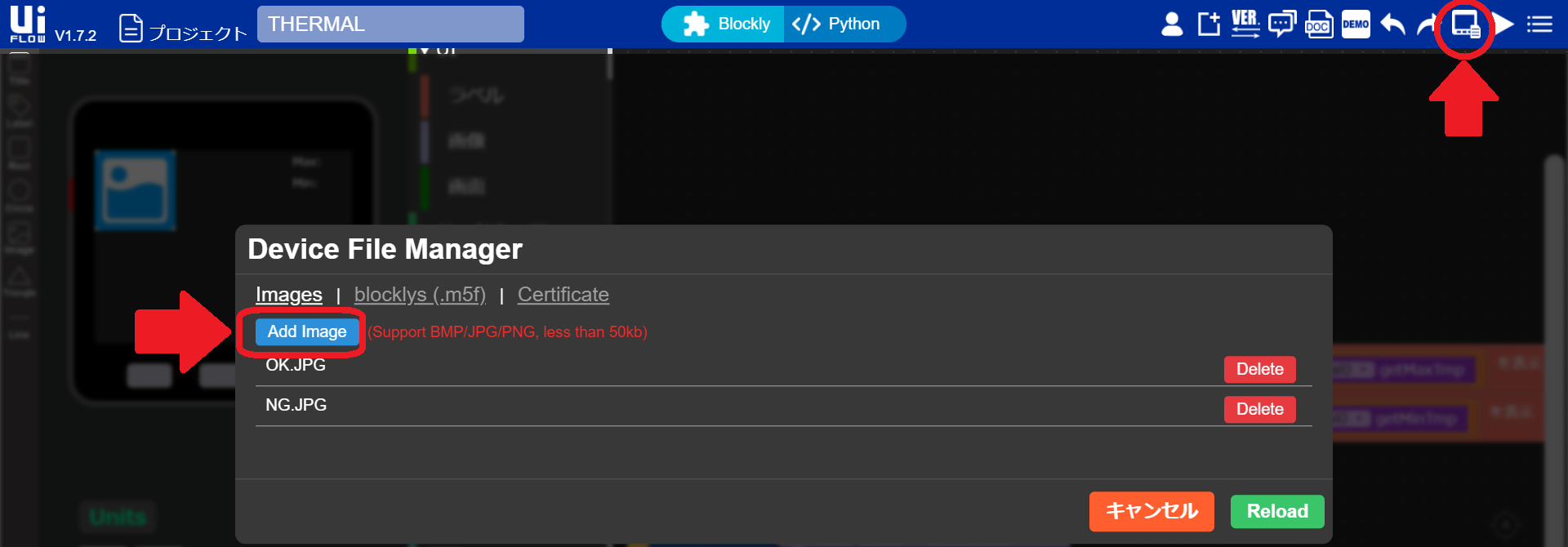 ④画面右上にある「MANAGER」ボタンを選択し、Device File Manager->Images->Add Imageから、画像を選択してM5Stack Basicに画像をアップロードします。
