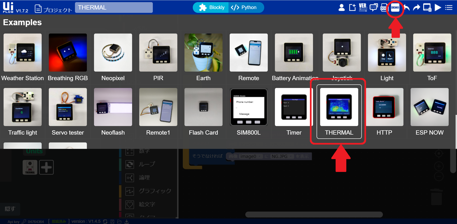 ③下図を参考に、画面右上の「DEMO」ボタンを開き、「THERMAL」を選択します。