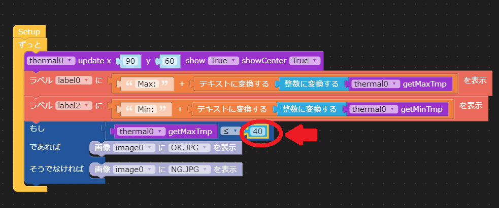 ⑤下図を参考に、ブロックや変数を設定します。図中に示した「40」の部分を、例えば「60」等に変えれば、猫舌の人が熱い飲み物の飲み頃を通知するようなシステムにすることができます。