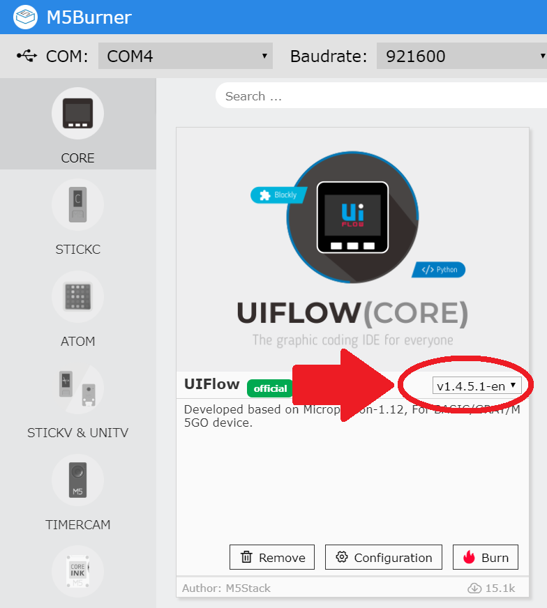 →M5StackのUIFlowのページから、ファームウェア書き込み用のツール「M5Burner」をダウンロードし、公式の手順に従ってファームウェアを書き込みます。