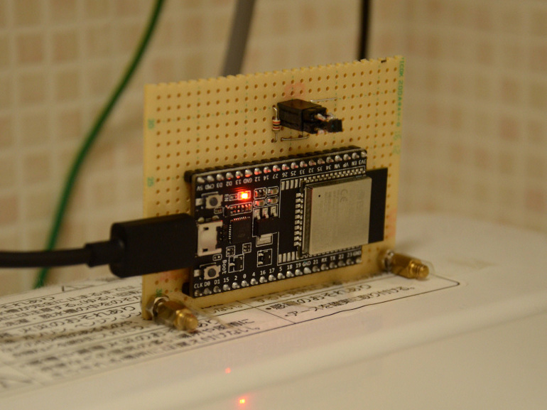 ちなみに、今回はESP32開発ボードのUSB端子で電源供給しましたが、乾電池4本が入る電池ボックスを買ってきてEXT_5V端子に接続すれば、コンセントに空きがなくても使えます。EXT_5Vと書いてありますが、1.5V×4=6V程度なら印加しても大丈夫だろうと思います。ESP32開発ボードの回路図を見る限り、EXT_5Vに接続されたコンデンサの耐圧は10Vだそうなので、マージンを考えて8V以上は印加しない方が良いと思います。006P電池は最初に9V以上の電圧が出るので、使わないほうが良いでしょう(ダイオードを2、3個直列につなぎ、電圧を下げる手もありそうですけど)。