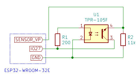 そのため、フォトリフレクタに供給する電源をON/OFFできるようにしました。具体的にはIO27を使い、TPR-105FのLEDおよびフォトトランジスタへの電源供給を制御します。IO27をHigh(3.3V)にするとLEDが点灯し、フォトトランジスタが動作します。LEDは10mA程度の電流を消費しますので、この工夫による省電力効果は非常に高いです。