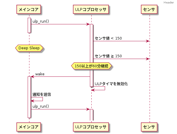 メインコアはセンサ値読み取りのためのADC(アナログデジタル変換器)などの初期化をした後、ULPコプロセッサ用プログラムの準備を行い、最後にULPコプロセッサを起動してDeep Sleepモードに移行します。ULPコプロセッサがwake命令を発行するまでDeep Sleepが継続します。